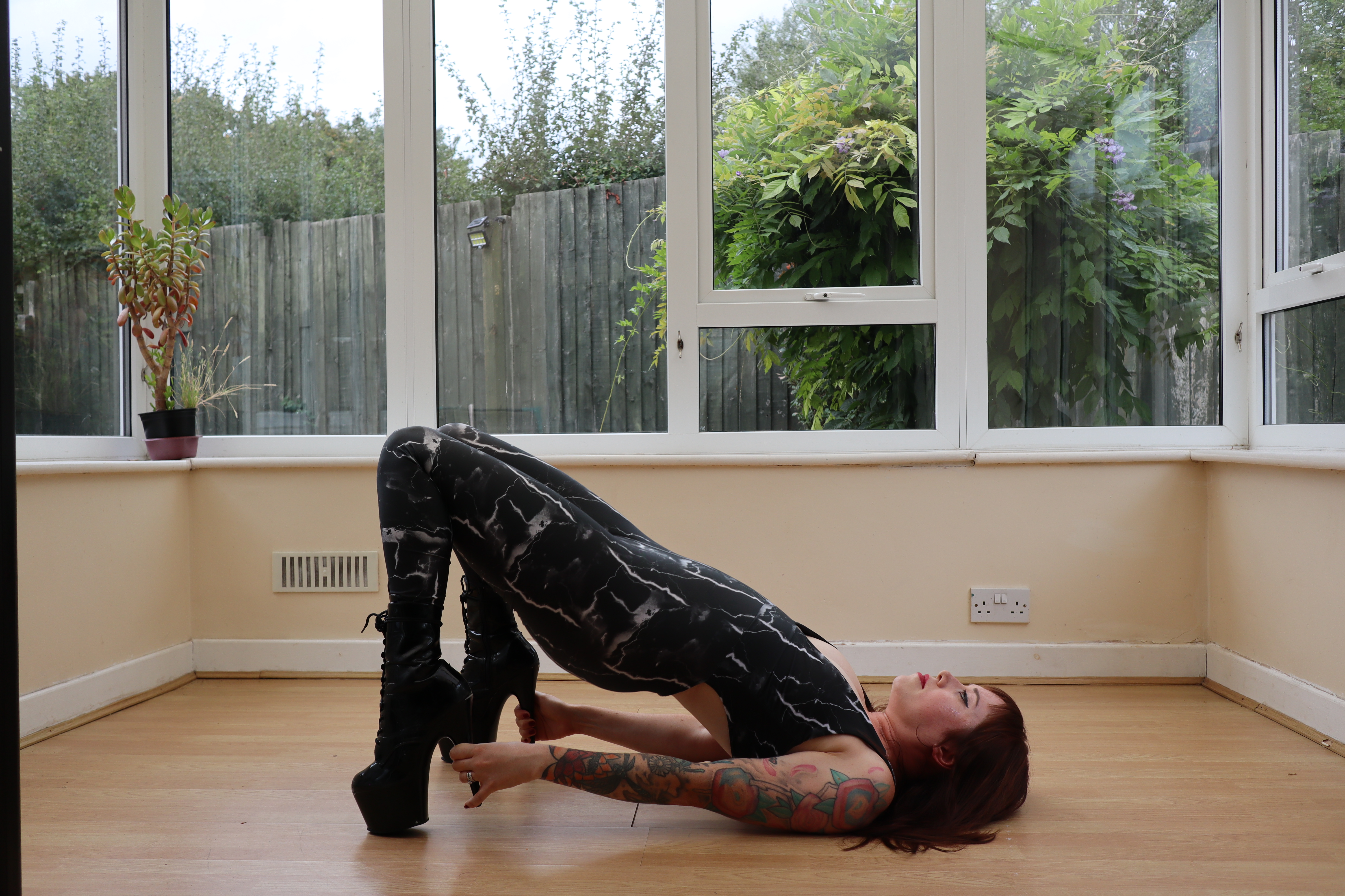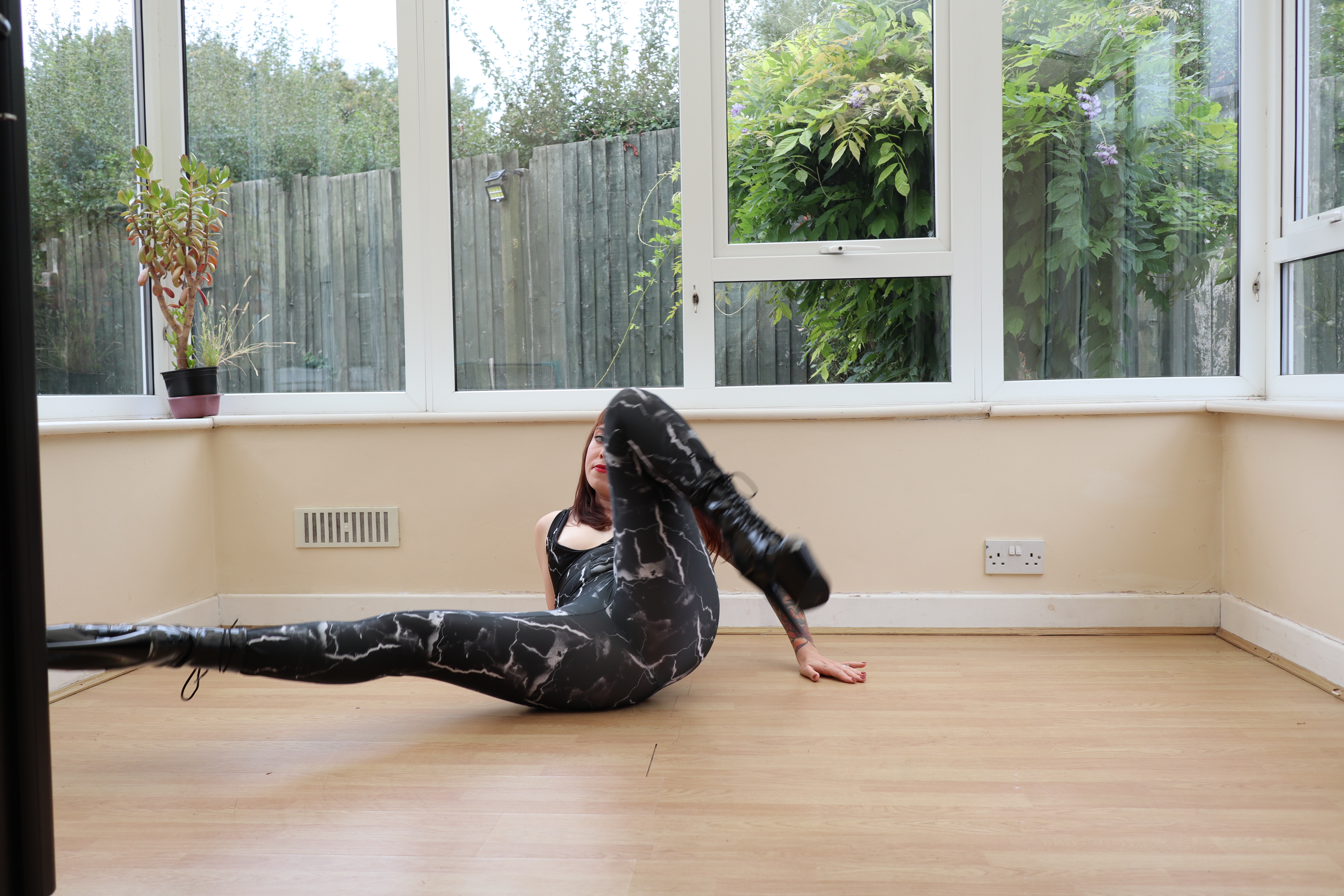 We have now entered the leg section! First up on my list of leggy floorwork moves are some classic leg switch swooshes (like I said, I am not entirely sure if this is the technical name but it’s what I’m calling it). To do these, you simply cross one leg over the other as seen in the pictures above, uncross your legs so they’re apart in a small, bent leg spreadie, then cross them again but in the opposite direction, so the bottom leg last time is on the top this time. Does that make sense or is it a bit bloody obvious why I’m not a pole teacher? Anyway, I find this move bold, dynamic and if you add in a dramatic windmill with your hair during it (providing you have the coordination, as I just tried it and nearly toppled over), to look pretty damn epic too.